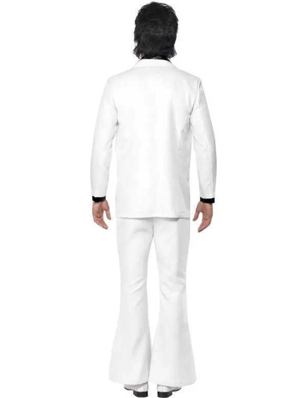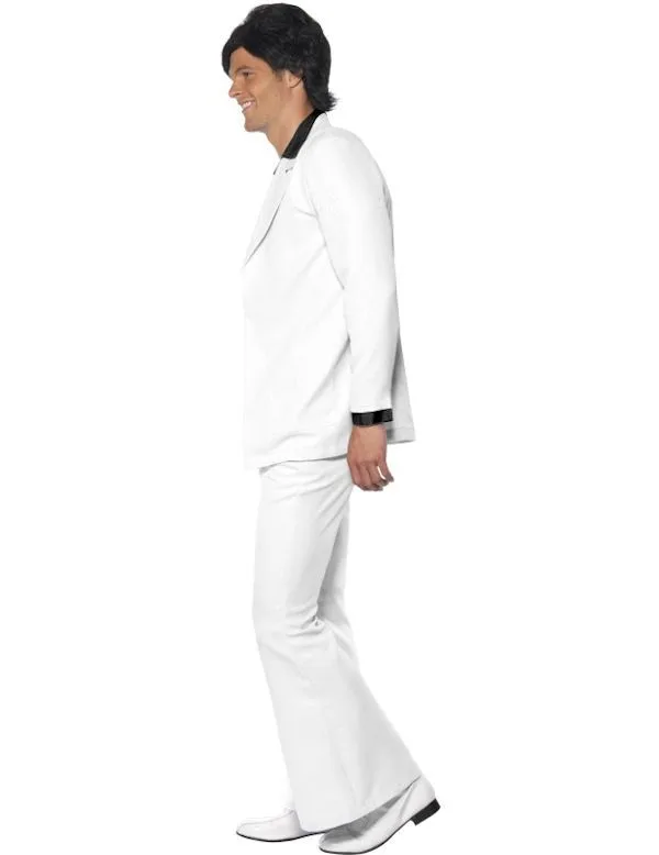 In dit smetteloos witte herenpak , bestaande uit een pantalon en jas met zwarte kraag sla je nooit de plank mis op een jaren 60&70 feest. Vanavond kruip jij in de huid van John Travolta als je op je plateauzolen alle danspassen uit Saturday Night Fever showt! In de nauwsluitende broek die ervoor zorgt dat je achterwerk goed geaccentueerd wordt met daaronder de wijde pijpen. Het loopje er al briljant uit als jij de biertjes haalt aan de bar op Staying Alive.