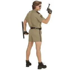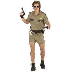 Wanneer het een zonnige dag is, dan wil je natuurlijk niet in zo’n strak donker pak lopen. Het zweet breekt je al uit bij die gedachte. Met dit lekkerzittende bruine uniform voor mannen in de jaren 80 stijl, loop je er gelijk wat luchtiger bij. In de korte broek kun je nog steeds, als een jonge atleet, de wetsovertreders bijhouden. Het shirt met korte mouwen zorgt voor voldoende bewegingsvrijheid voor je armen, om snel je wapen te kunnen trekken. De bijpassende riem laat jouw brede torso nog beter uitkomen. Daarnaast trekken die blote gespierde benen natuurlijk de aandacht. Ze stoppen maar al te graag voor jou.