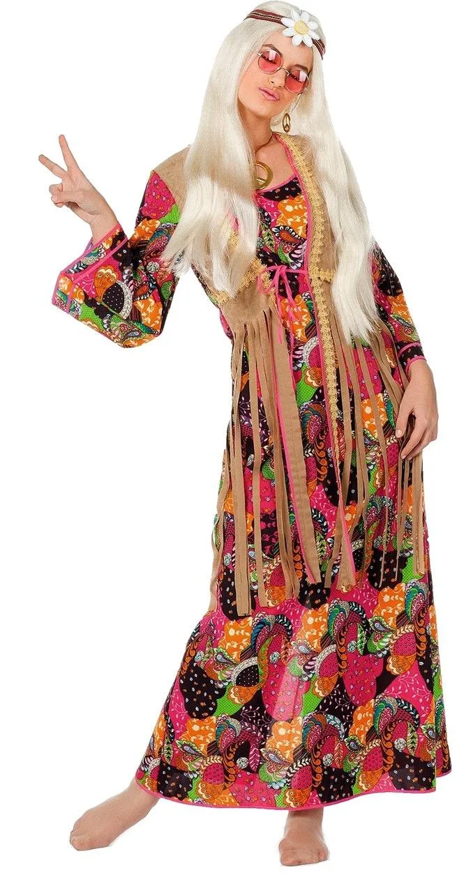 Smoking hot is deze Smoking Hippie Lange Jurk misschien niet, maar smoking hippie wel degelijk! En eerlijk is eerlijk dit psychedelische Multicolor Kostuum is toch 100% Flower Power? Deze vrouw is al druk het Peace-teken aan het oefenen. En wil je van deze kleding echt een smoking pak maken, neem dan die waterpijp mee naar dat Hippiefeest. Die staat toch al jaren te verstoffen op zolder! Zet een zo’n grappig Yoko Ono-brilletje op, en je ziet alles door een roze bril.
